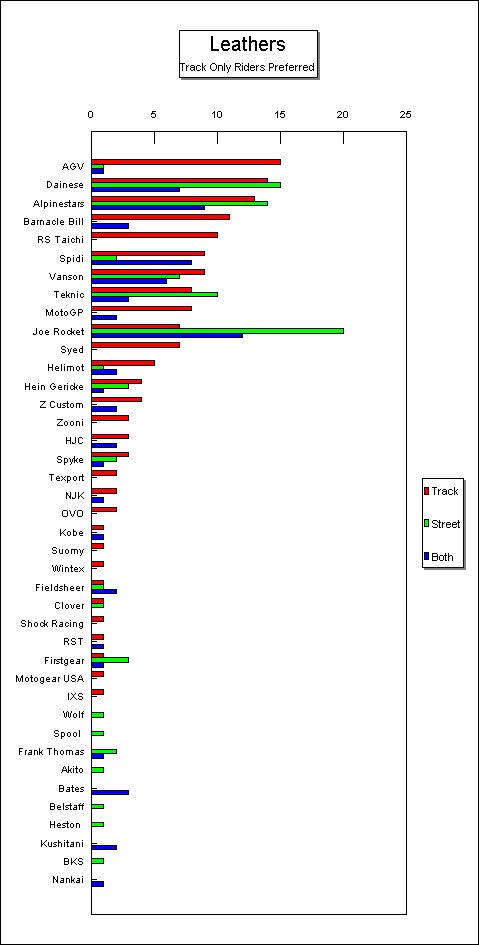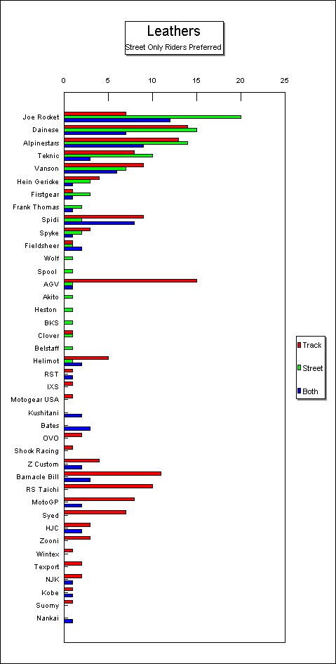 Top 10 brands of leathers preferred by Street Riders: JoeRocket Top 10 brands of leathers preferred by Track Only Riders (many are WERA racers): AGV