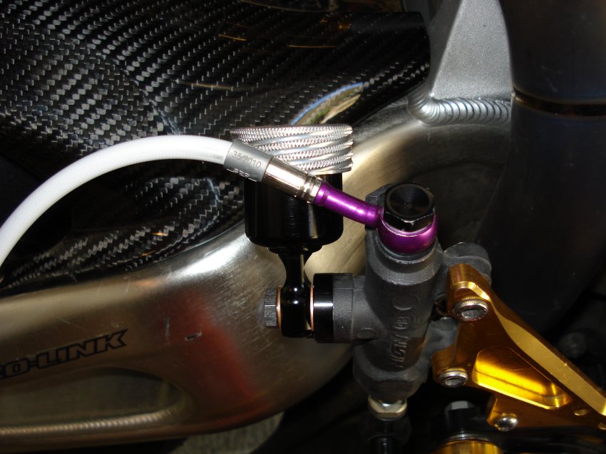 Well somehow I mananged to put a hole in the res line at the track & brake fluid was dripping down all over the place so Sato hooked me up with a new Rear Reservoir prototype they have been working on. It's not really designed for my bike nor the placement I put my brake line in, but since the reservoir is capable of being mounted in any orientation I took advantage of that & simply tilted it to one side to clear the line & I now have a working reservoir that is tucked out of the way of my big ass feet and neatly into the nook of the swingarm with plenty of clearance