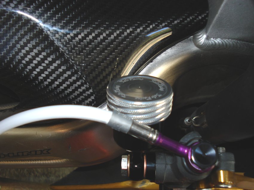 Later I went back to the OEM Reservoir and line, but relocated it slightly back & below the seat to keep it out of the way a little better